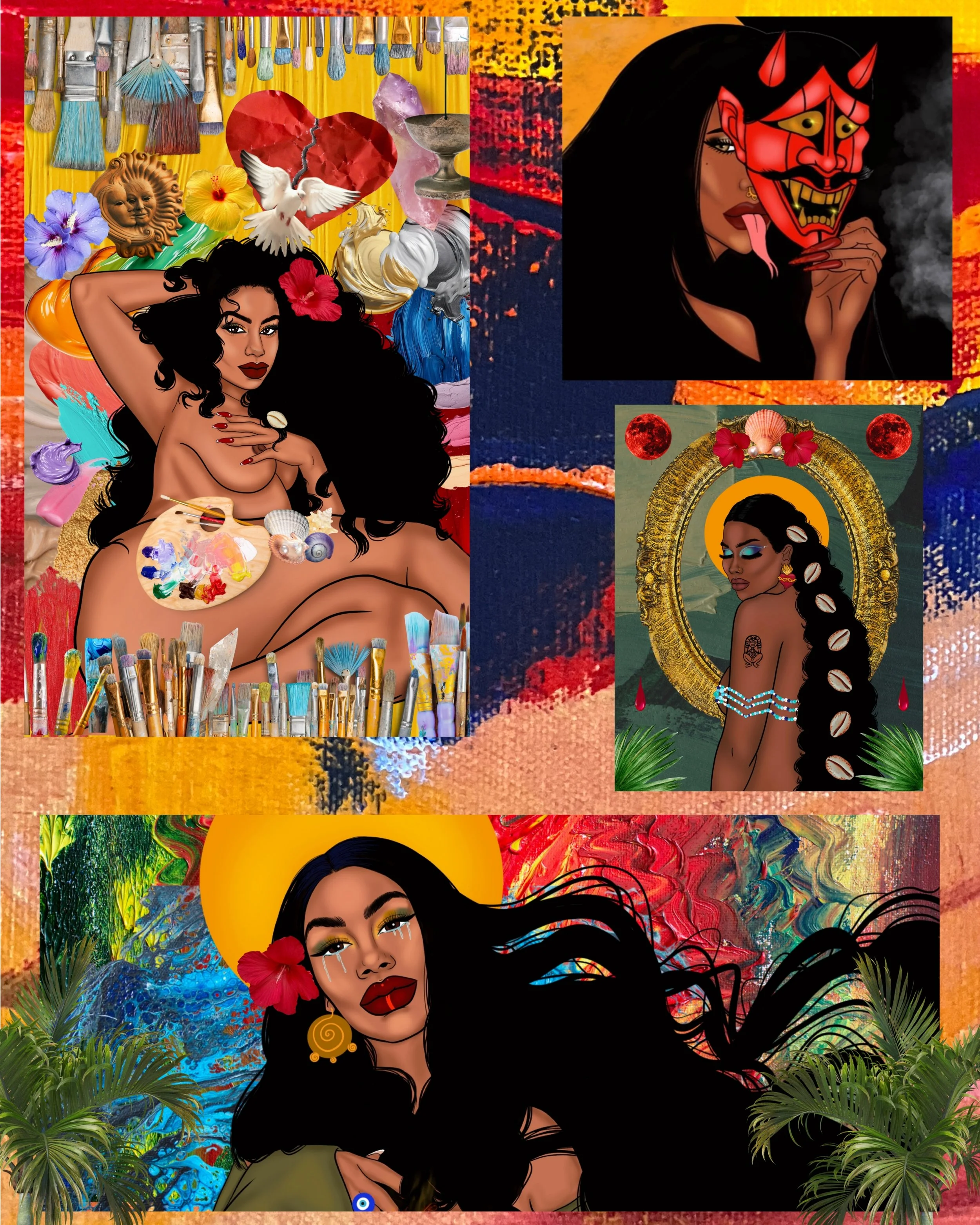 Luna's work is unapologetically bold, rooted in color, symbolism, and emotion. She uses visual storytelling to merge sacred imagery with modern narratives, creating spaces where femininity is both celebrated and feared. Every element is intentional: the palette, the textures, the symbols—they speak a language of survival, sensuality, and truth.