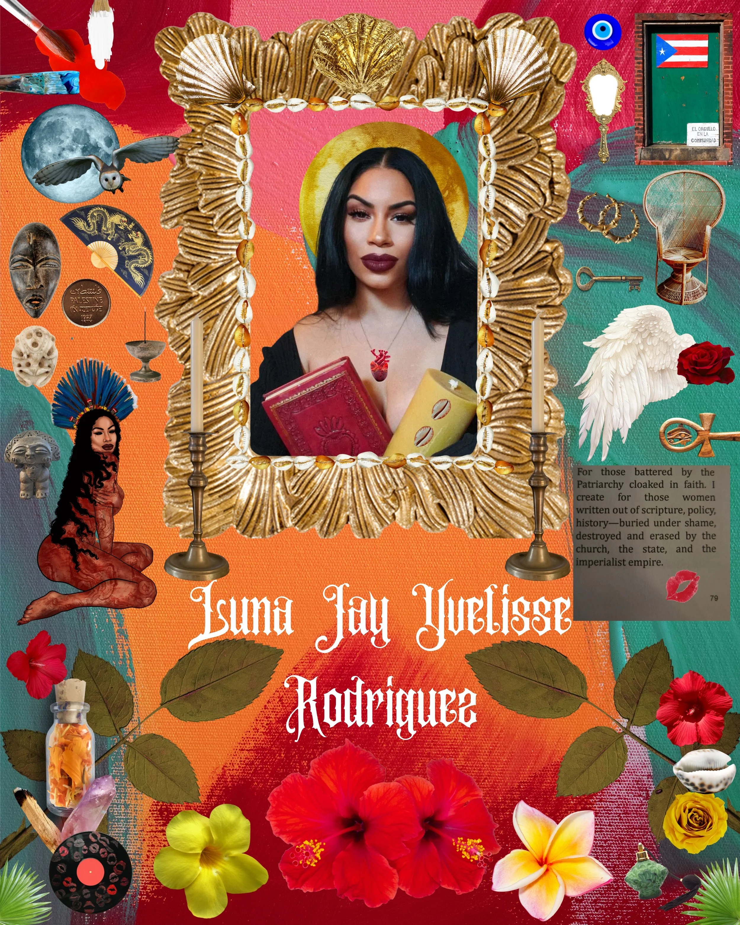 Luna Jay Yvelisse personifies the epitome of a versatile Nuyorican: an accomplished multidisciplinary artist, devoted mother, clairvoyant clairsentient, cook, activist, social and political critic. Her creative practice spans painting, sketching, illustration, mixed-media collage, and digital art, each serving as a vessel to convey earth, espiritu, bones, and blood. She captures her inspiration, liberty, and intricate emotions. Luna’s work explores the intersections of identity, culture, race, womanhood, femininity, and bodily autonomy. Rooted in her Afro-Indigenous Caribbean heritage, her art often confronts challenging issues such as misogyny, abuse, sexual violence, motherhood, and resilience, weaving stories of womanhood and liberation through both personal and collective experience.